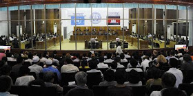 Carl Robinson (R), former Associated Press correspondent and Chhang Song , former Khmer minister of information, stand near the sign dedicated to the memory of Cambodian and foreign journalists killed or missing during the Cambodian civil war April 22, 2010. About 40 retired journalists gathered on Thursday to officially commemorate more than 50 correspondents from Japan, France, the U.S., Cambodia, Australia, Switzerland, Germany, Austria, India and Laos, who were killed while covering the conflict, which lasted from 1970-1975. REUTERS/Chor Sokunthea